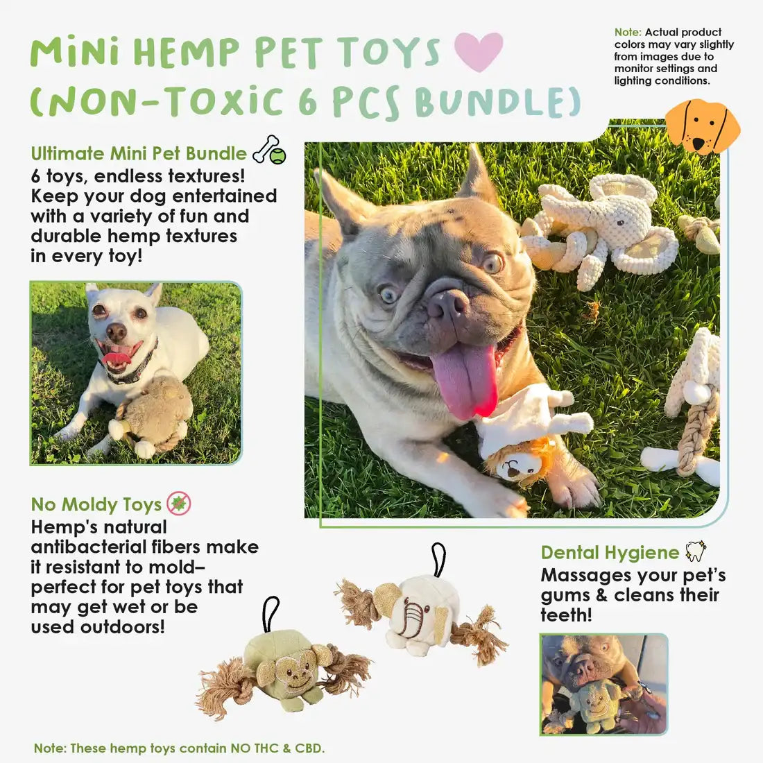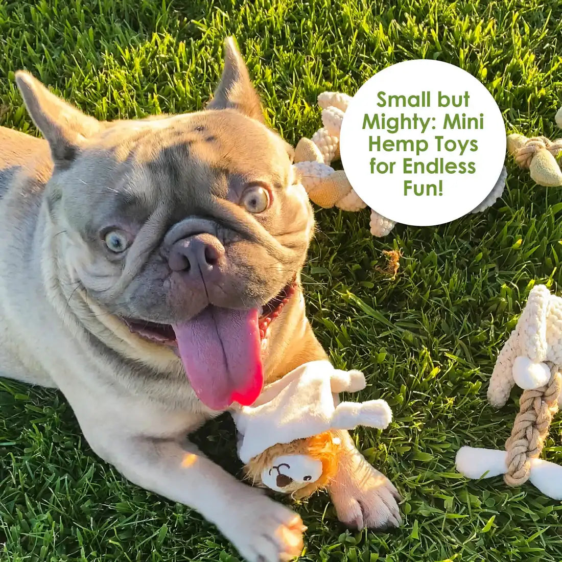 Petique's Mini Hemp Pet Toy 6-Pack Bundle. 2 mini pet toys in each pack. Total of 6 Mini Eco-friendly, durable, and irresistible Pet Toys! Perfect for dogs who love to play, chew, and stay healthy.