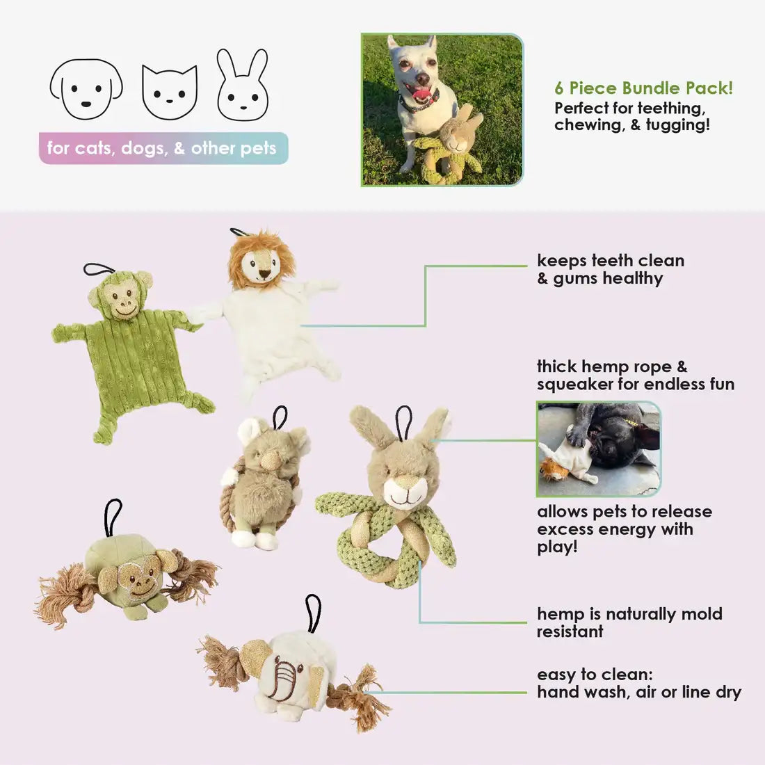 Petique 6 Piece Mini Hemp Pet Toy Bundle Pack: Eco-Friendly Pet Toys for Dogs & Cats, Non-Toxic, Durable, Squeaky Fun, Mentally Stimulating Chew Toys, Hemp Rope for Teeth Cleaning, Plaque Reduction, and Gum Massage, CE Certified Safe Pet Play Toys