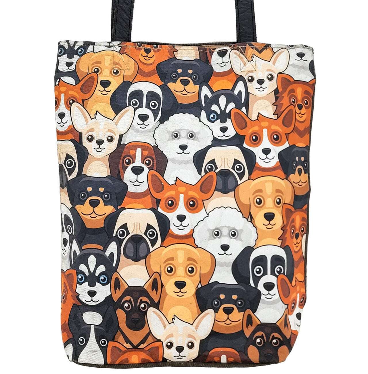 Our recycled military tent tote features leather handles and an open top with magnetic snap closure, 1 interior pocket, a vintage-style print on the front and is fully lined.