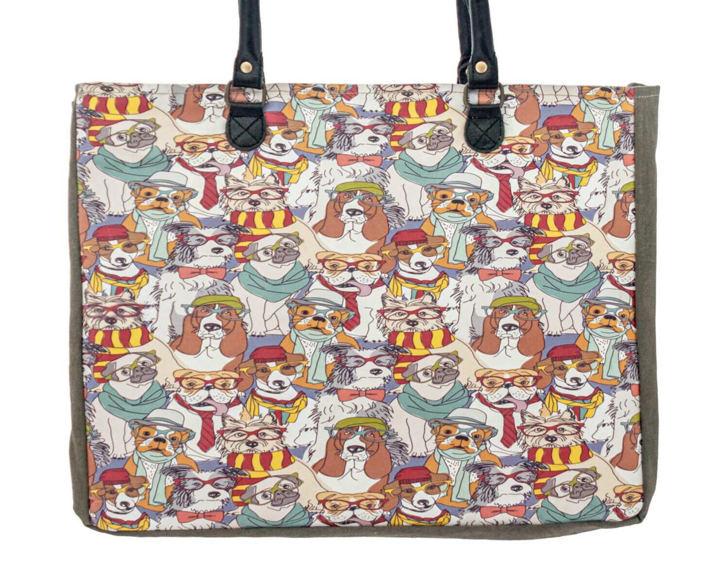 Our market tote is handcrafted with authentic recycled military tent, has a zipper top closure as well as 1 interior pocket, is fully lined, and has rolled leather handles with a comfortable 12.5 inch drop.