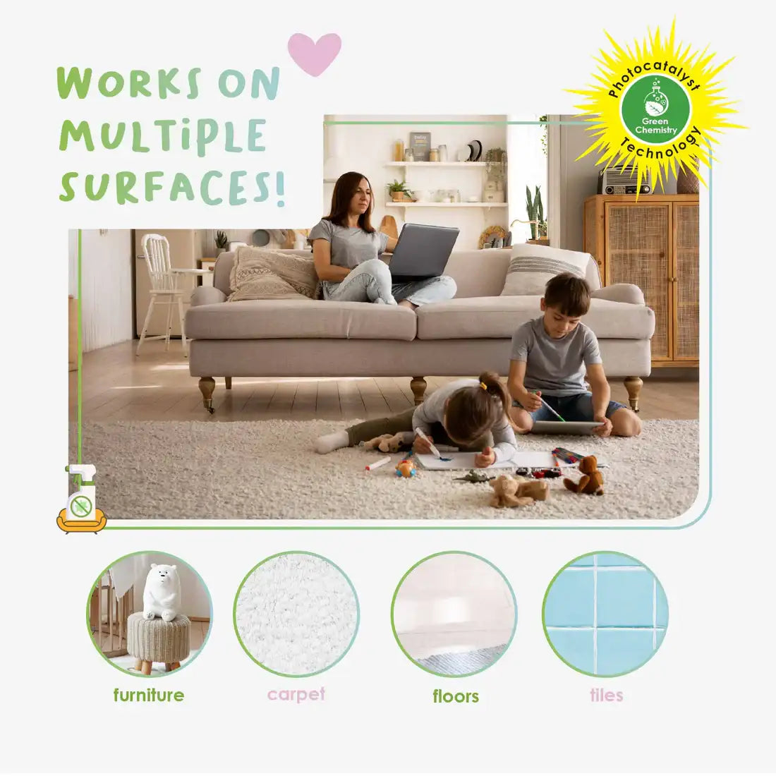 🌿 GREEN CHEMISTRY FORMULA: Utilizes photocatalyst technology to instantly dissolve and decompose tough odor molecules, converting them into harmless H2O & CO2.
